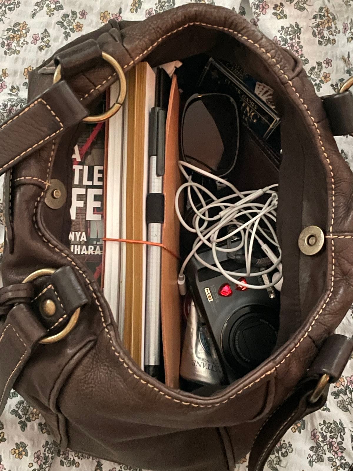 Inside it, you will not find the usual digital arsenal. No chargers, no AirPods, no backup batteries. Instead, there are paperback books with creased spines, 35mm film cameras, handwritten journals, crossword puzzles, sketchpads. Objects that do not notify, vibrate, or demand attention.