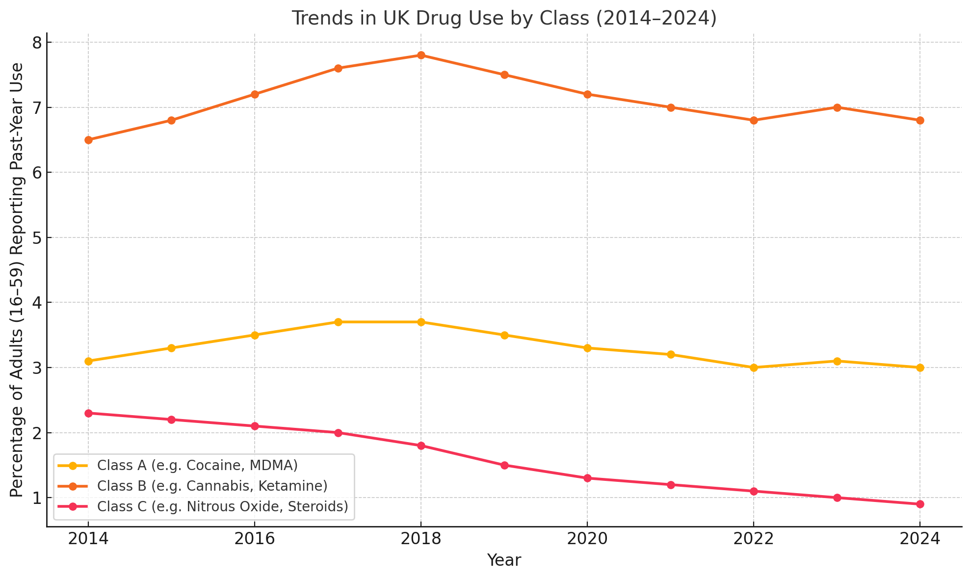 These are the headline-grabbers: cocaine, MDMA, LSD, mushrooms, heroin. They’re the substances that get name-dropped in tabloids and techno raves alike. And over the past ten years, Class A drug use has hovered around 3% of the adult population, with a spike in the late 2010s that has since receded.