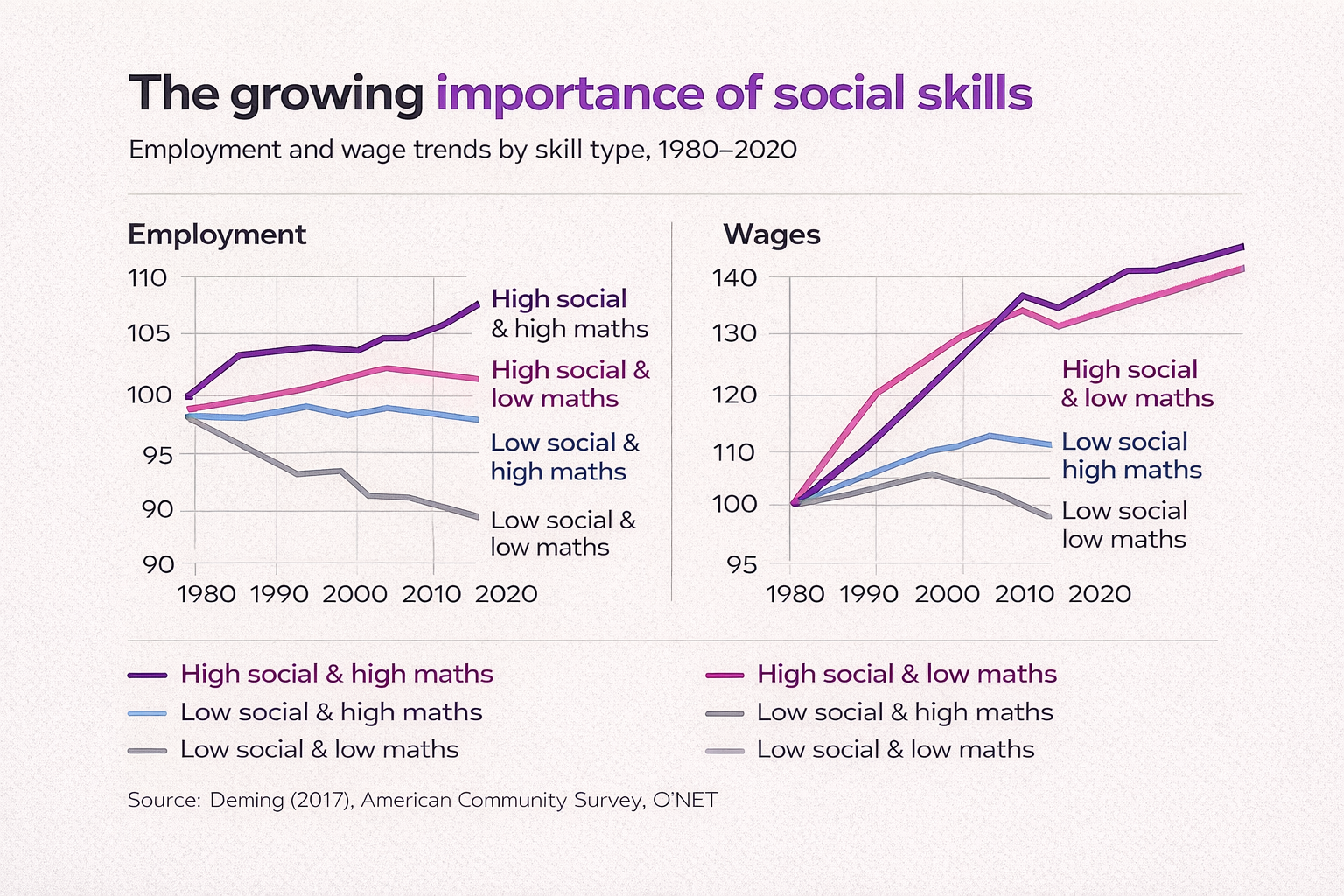 Economist David J. Deming analysed decades of labour market data to understand how job requirements have shifted over time. His findings are striking. Between 1980 and 2012, occupations requiring strong social skills increased their share of the workforce by nearly twelve percentage points. During the same period, many roles that were highly technical but low in social interaction declined.