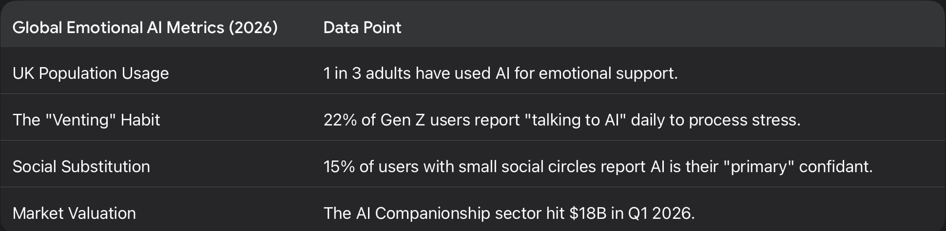 The behavioral shift is most visible in the "Friendship Recession." As traditional social structures—community hubs, religious centers, and even consistent third places—continue to erode, AI has stepped into the vacuum.
