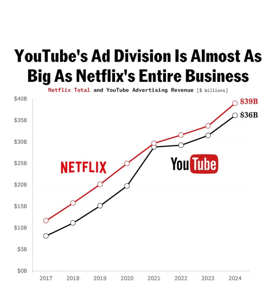 Imagine a digital coliseum where two titans clash: on one side, Netflix, the streaming behemoth that redefined how we devour stories, raking in $39 billion in total revenue by 2024. On the other, YouTube’s ad division, a relentless ad-powered juggernaut, surging to $36 billion in advertising revenue over the same span. This graph, tracing their financial trajectories from 2017 to 2024, reveals a stunning convergence: YouTube’s ad earnings are nearly as vast as Netflix’s entire business. From a modest $10 billion in 2017, Netflix climbed steadily, while YouTube’s ad revenue leapt from $5 billion to challenge the streaming giant’s dominance.